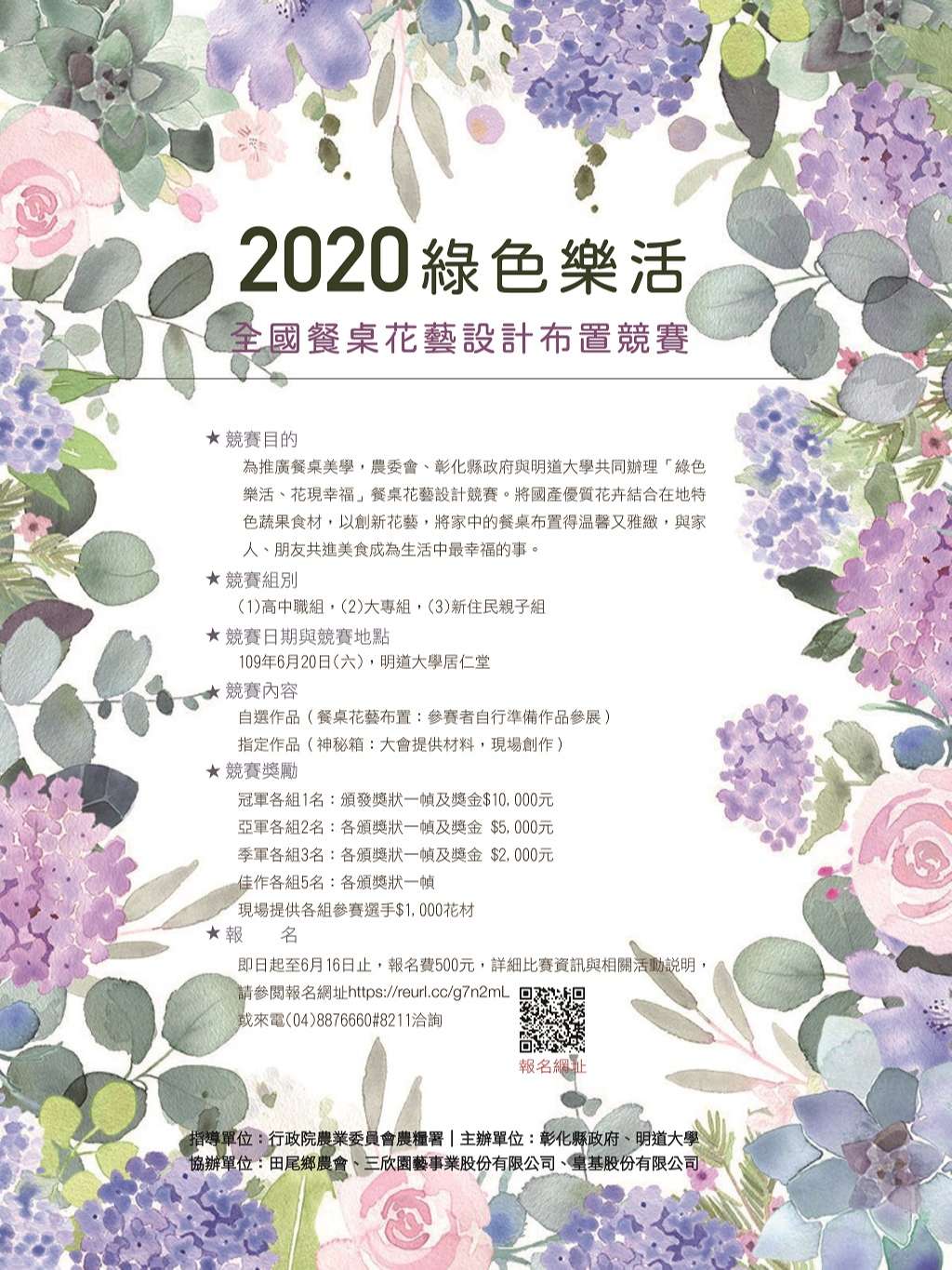 行政院農業委員會及彰化縣政府為推廣國產花卉,辦理第一屆「2020全國餐桌花藝設計布置競賽」,鼓勵同學踴躍報名參賽。