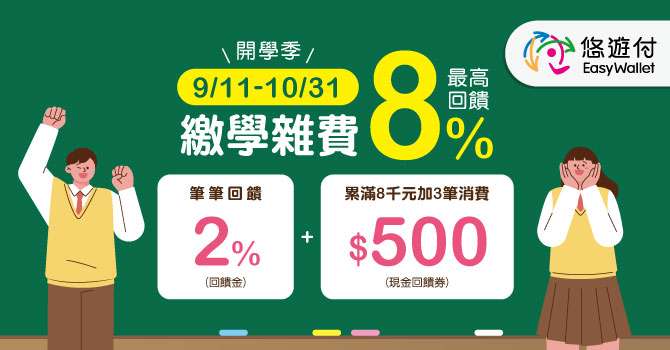 (二)活動內容:活動期間當月使用悠遊付每筆扣款享2%悠遊 付回饋金,另累積消費新臺幣(以下同)8,000元加3筆 消費即回饋500元現金回饋券,活動期間每戶最高回饋8% 悠遊付回饋金(或回饋券)。