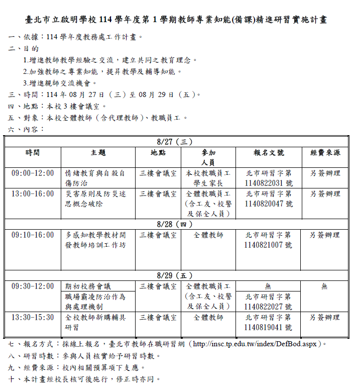 09:30-12:00:期初校務會議/職場霸凌防治作為與處理機制,報名文號:北市研習字第1140822027號。
