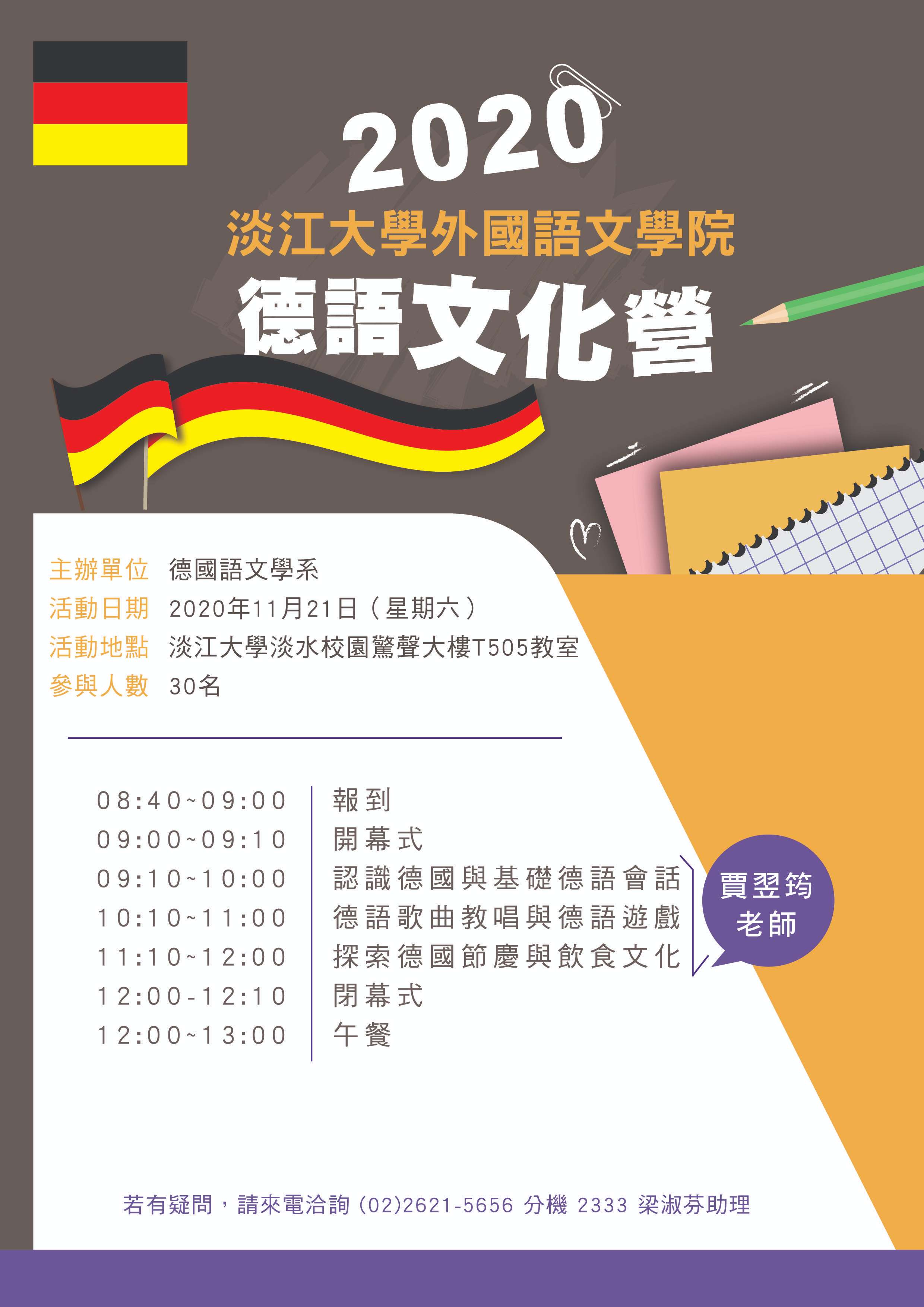 二、活動報名方式:一律採網路報名,自即日起至109年11月14日止,歡迎至本校活動報名系統報名,網址:http://enroll.tku.edu.tw/course.aspx?cid=tfgx1091121。