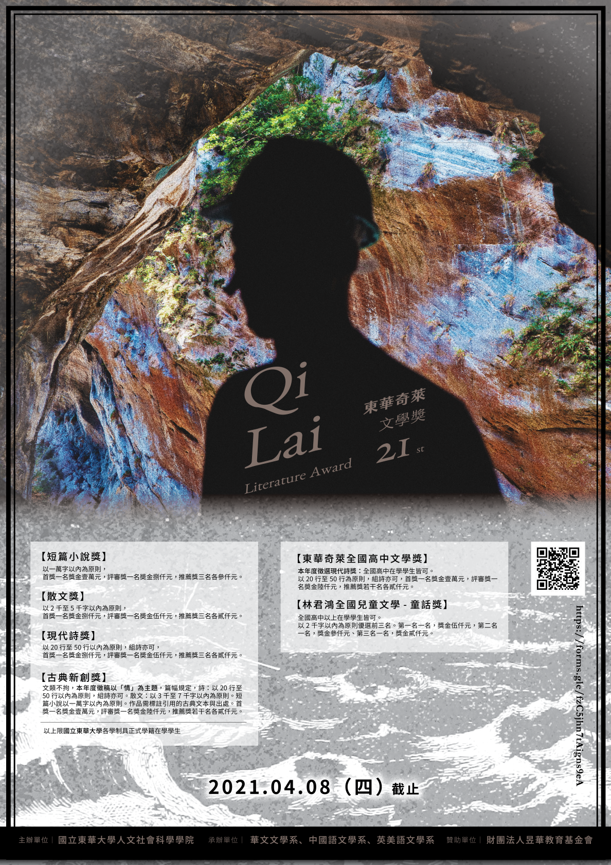一、「第21屆東華奇萊文學獎」針對高中生徵文獎項為「林君 鴻全國兒童文學-童話獎」及「東華奇萊全國高中文學-現 代詩獎」,希冀鼓勵國內創作風氣,培養文學涵養。