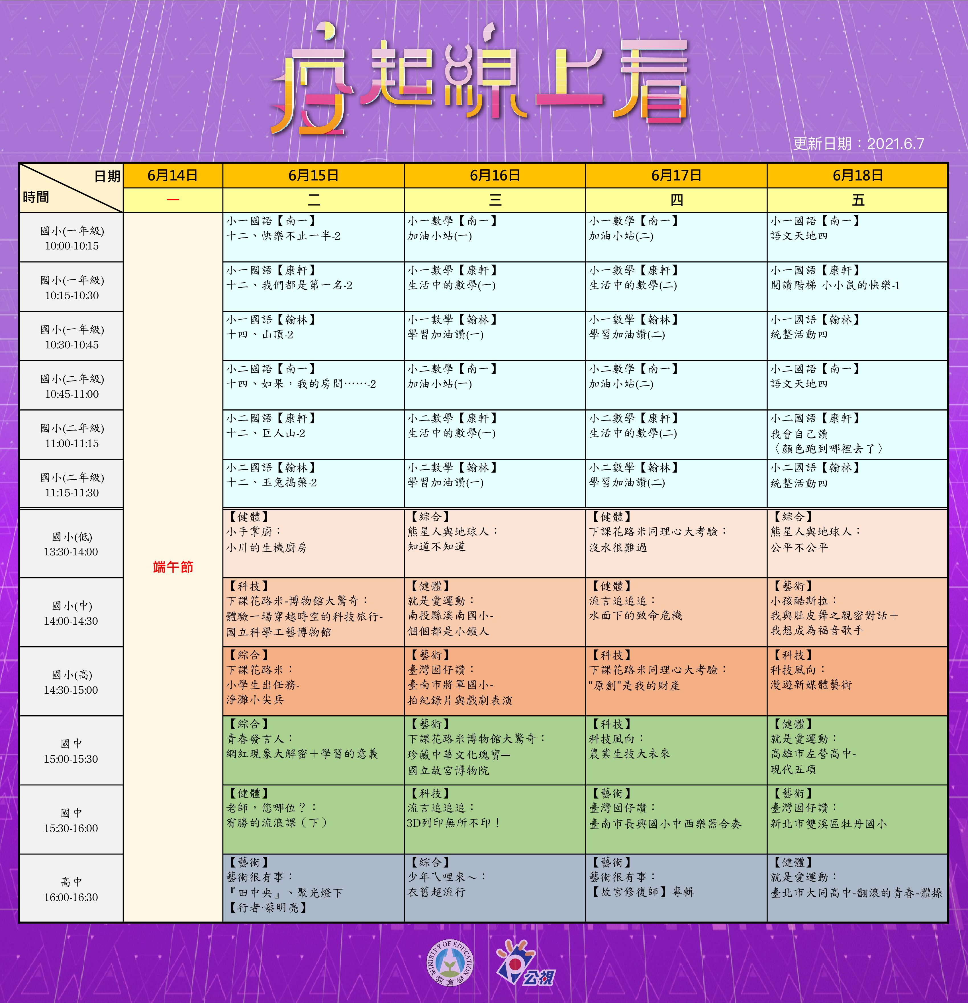 一、因應全國高級中等以下學校因應疫情延長學生停止到校上 課,採居家線上學習至110年7月2日,教育部賡續徵用公視 3台於週一至週五播出「疫起線上看」電視教學節目。 二、有關6月15日至6月18日之節目內容說明如下: (一)上午10時至11時30分播出國小一年級及二年級數學科、 國語科,每集15分鐘,依南一、康軒、翰林等3版本錄 製。台視綜合台於當日下午1時30分至3時重播。 (二)下午1時30分至4時30分播出藝術、健康與體育、綜合活 動、科技等4個領域,分為國小低中高年級各30分鐘、國 中60分鐘、高中30分鐘。台視綜合台於次日上午9時至12 時重播 三、如上開時段無法按時收視,亦可隨時至YouTube「公視網路 直播頻道」回溯收看,網址:https://reurl.cc /VEaXnN。 四、節目表公布於公視網站,請以關鍵字搜尋「公視3台節目 表」,或至本署「CIRN國民中小學課程與教學資源整合平 臺」首頁最新消息查詢及下載,網址:https://cirn.moe. edu.tw。