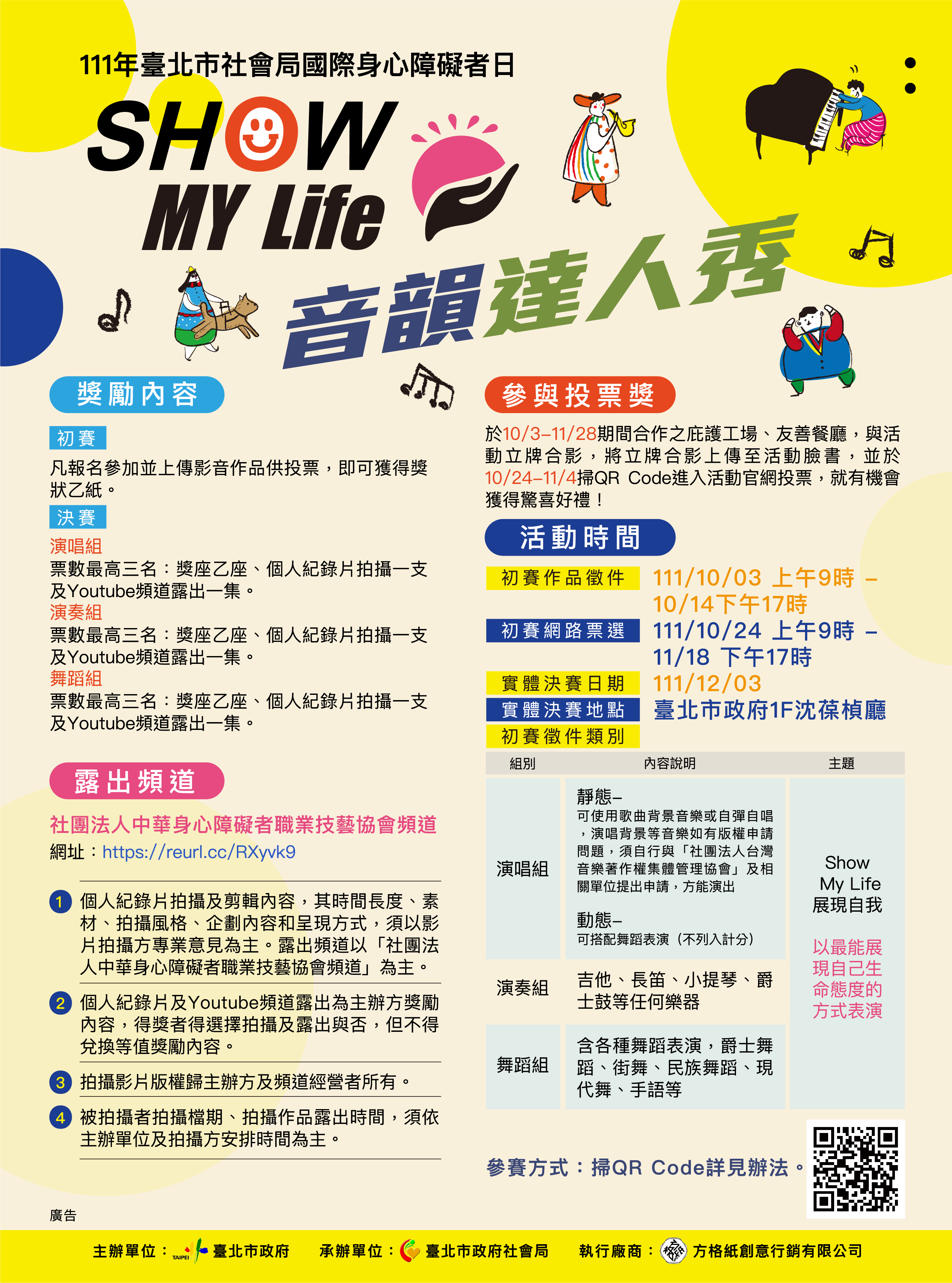 參加對象為臺北市身心障礙市民,投件報名時間為10/3-10/14,詳細活動內容請參考以下照片及活動網址,歡迎有興趣且符合資格的學生及師長報名