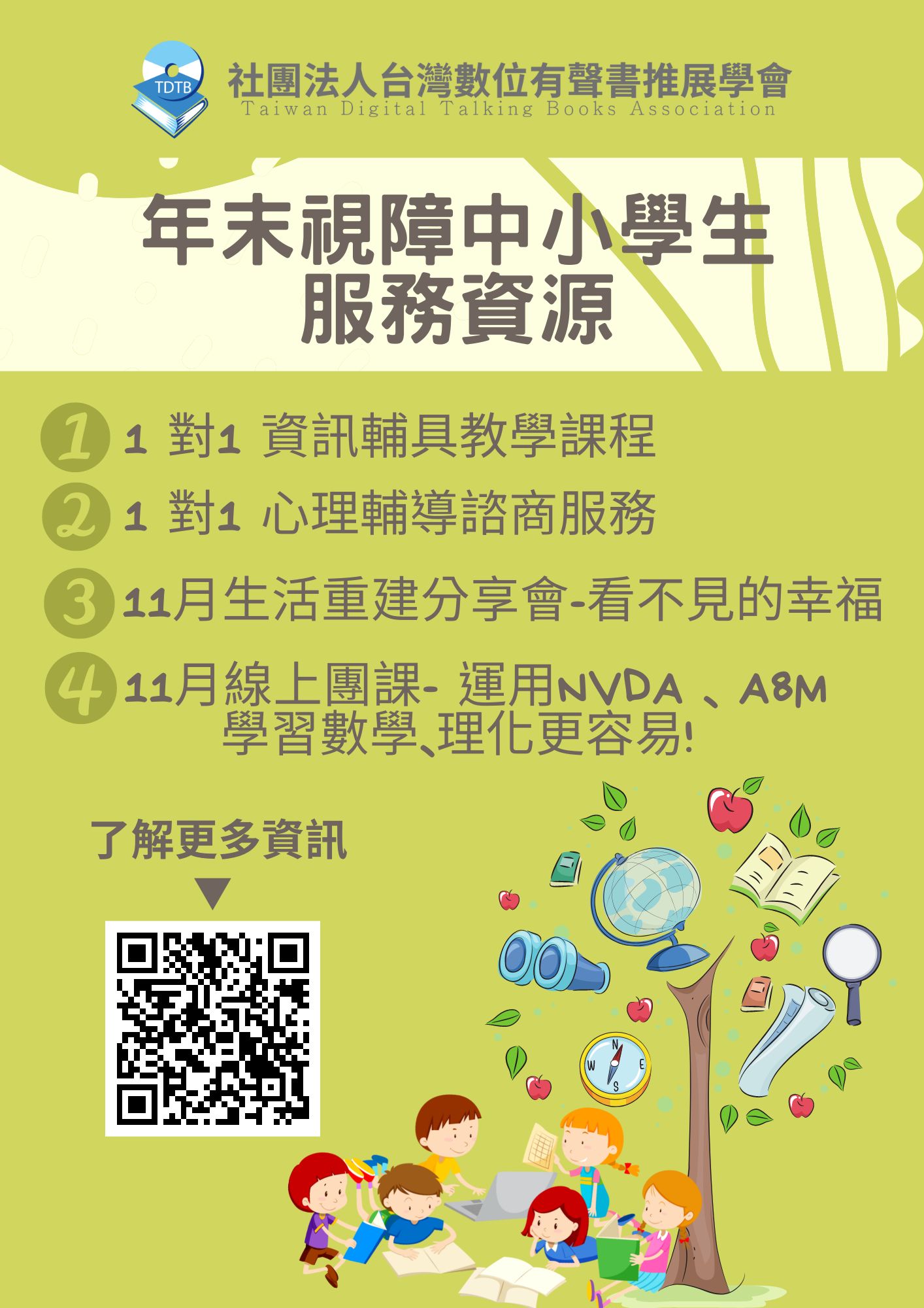 二、11月以及12月份年末服務資源及活動涵蓋1對1資訊輔具教學、1對1心理輔導諮商服務、11月生活重建分享會及11月數理線上團課等,詳細內容及報名方式如下。