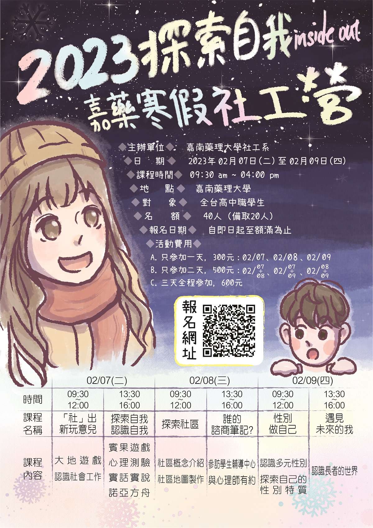 一、旨揭該系,為幫助全國高中職學生探索自我並學習助人技 巧,特規畫「2023探索自我 inside out • 嘉藥寒假社工 營」(以下簡稱社工營)。