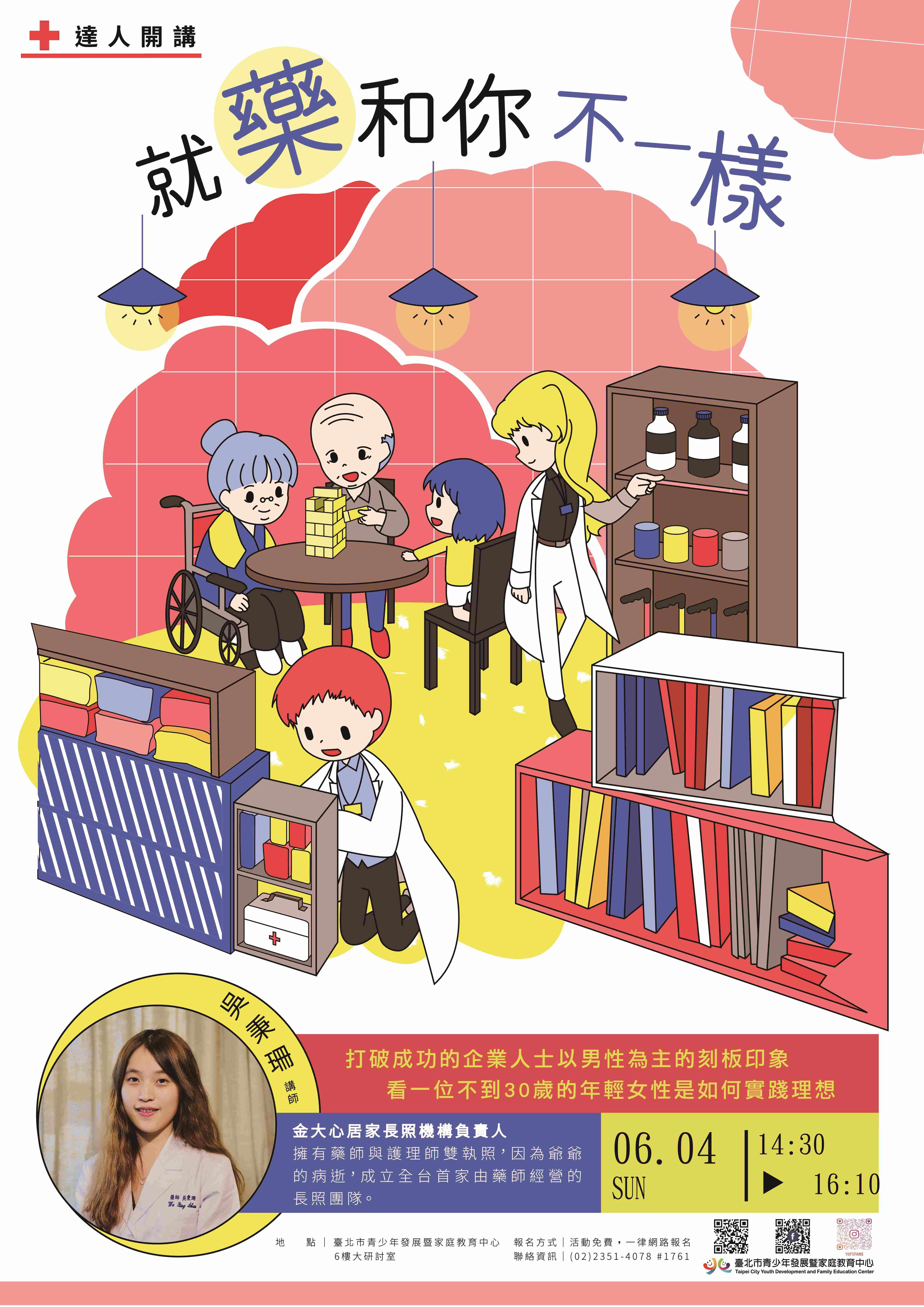 (一)90字:臺北市青少年發展暨家庭教育中心6月4日14:30舉 辦達人開講「就藥和你不一樣」,金大心居家長照機構 負責人吳秉珊老師與您分享她經營長照團隊的心路歷 程,以及過程中的體驗。活動免費,詳見青發家教中心 官網。