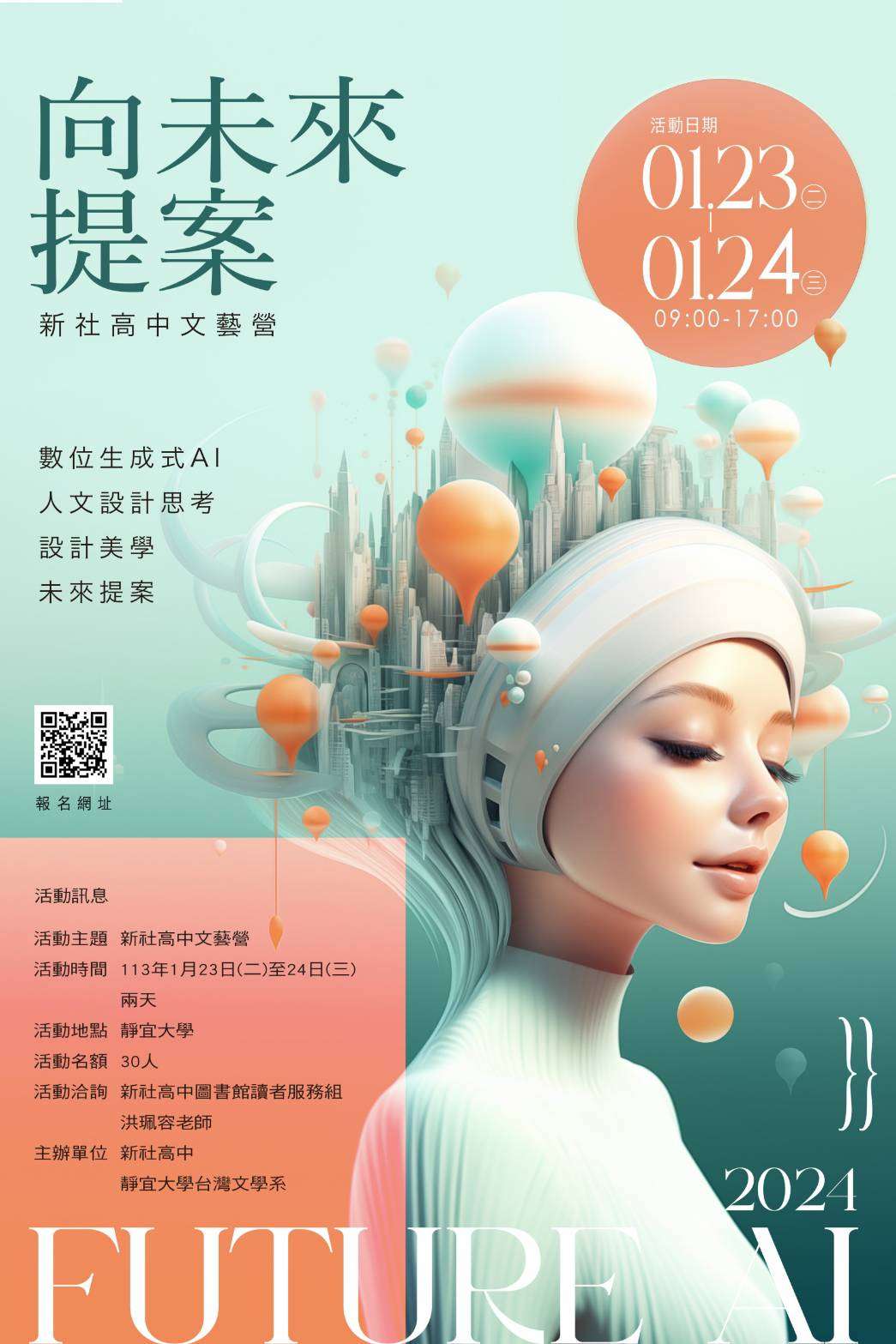 一、靜宜大學台灣文學系於寒假辦理文學營隊,2024年以「向未來 提案」為題,運用「數位生成AI」,進行人文設計思考及 設計美學創發,讓學生由文字進行文學轉譯,向「未來」 提案。