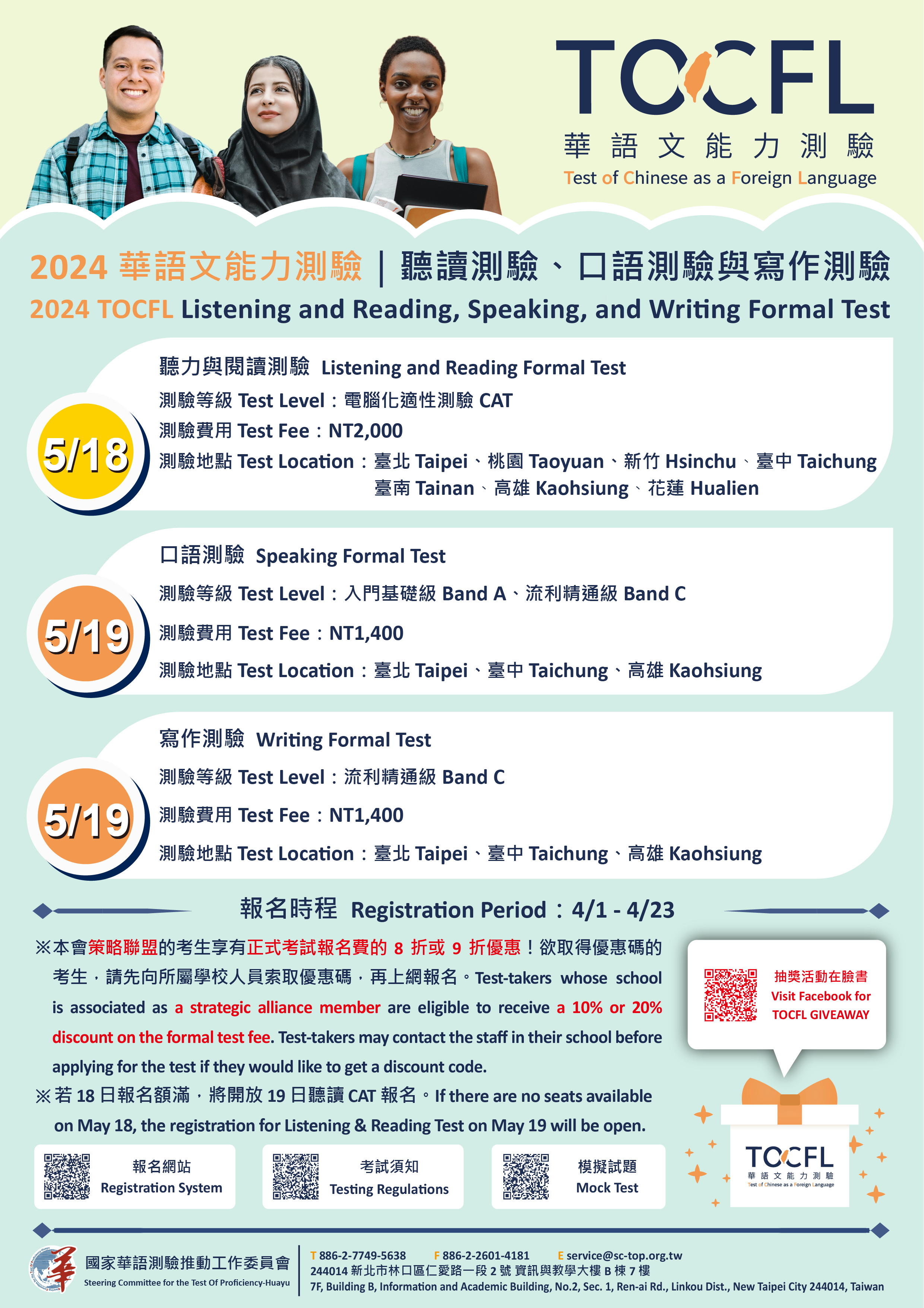 六、抽獎活動:凡報考口語或寫作測驗並完成繳費者,可參加 華測FB粉絲專頁抽獎活動。詳情請見粉絲專頁貼文: https://www.facebook.com/SCTOP.TOCFL。