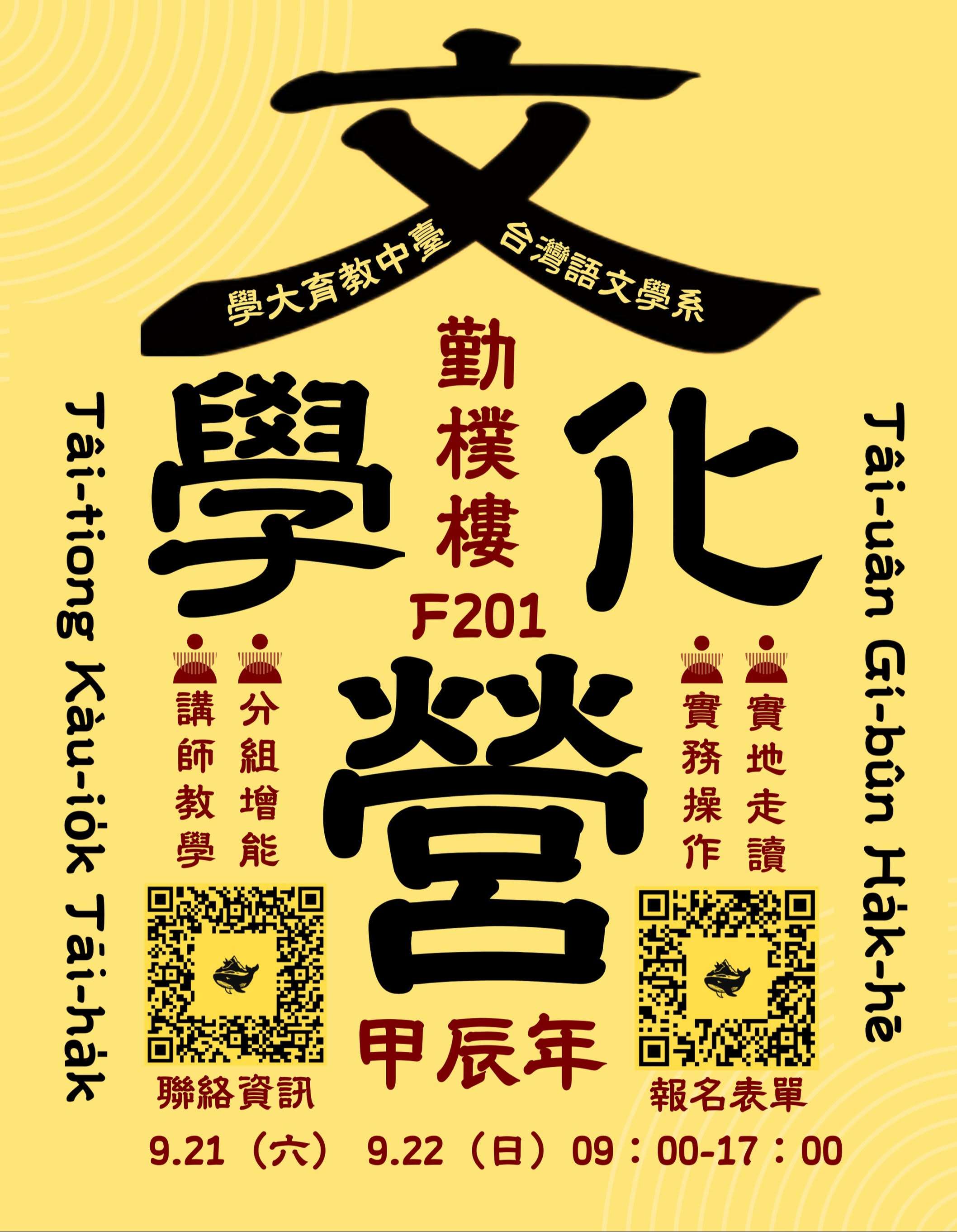 二、營隊資訊: (一)活動日期:113年9月21日(六)及113年9月22日(日),兩天活動獨立且不過夜。 (二)活動地點:國立臺中教育大學(403台中市西區民生路 140號)勤樸樓F201及學校周邊。 (三)招募對象:全國各公私立高中職學生,共計60名(含應 屆畢業生,國三升高中者亦算在內)。 (四)活動費用:每人每天新台幣150元整。(五)報名期限:即日起至113年9月11日(三)截止。 (六)報名方式: 1、採網路表單報名。表單連結:https://forms.gle /LYnyRSJ4JTn2Y9ia8。 2、填寫表單後,113年9月15日(日)將於台灣台語文學 文化營IG(連結https://reurl.cc/QEZ7AO)公布錄取名單。 3、錄取名單將以「自我介紹/參加緣由內容」篩選,敬請 用心填寫。 (七)活動內容詳如附件海報,如有相關問題,請洽詢本活動 聯絡人: 1、會長:李同學,電話:0983-336-318,E-mail: ata111123@gm.ntcu.edu.tw。 2、副會長:鍾同學,電話:0900-675-625,E-mail: gino6871015@gmail.com。