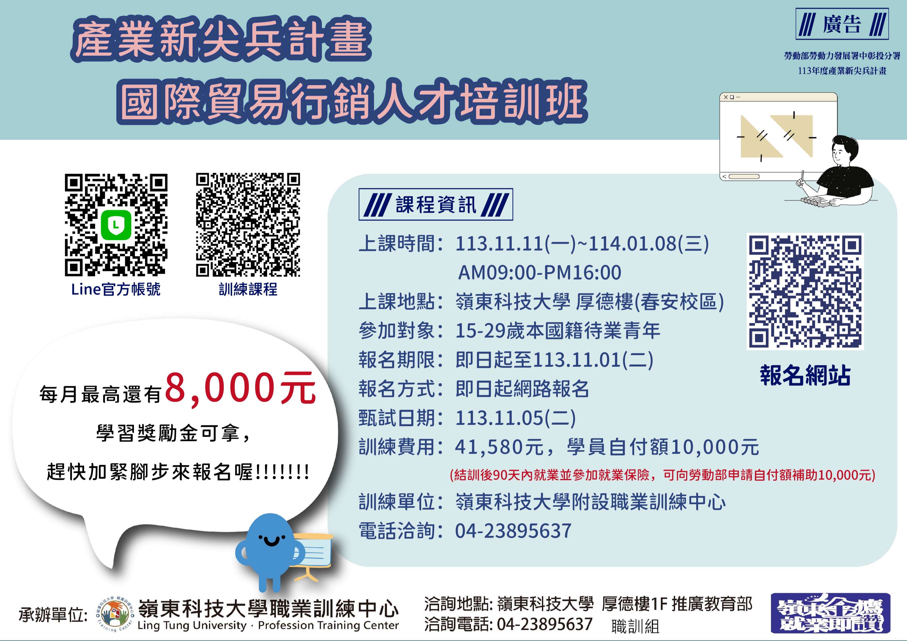 一、嶺東科大職業訓練中心承辦勞動部勞動力發展署「產業新尖兵 計畫-國際貿易行銷人才培訓班」,協助勞動部進行失待業 青年職業訓練,建立國際貿易、國貿經營及創意行銷之產 業人才,及輔導學員考取國際貿易丙級證照,增加個人就 業競爭力。