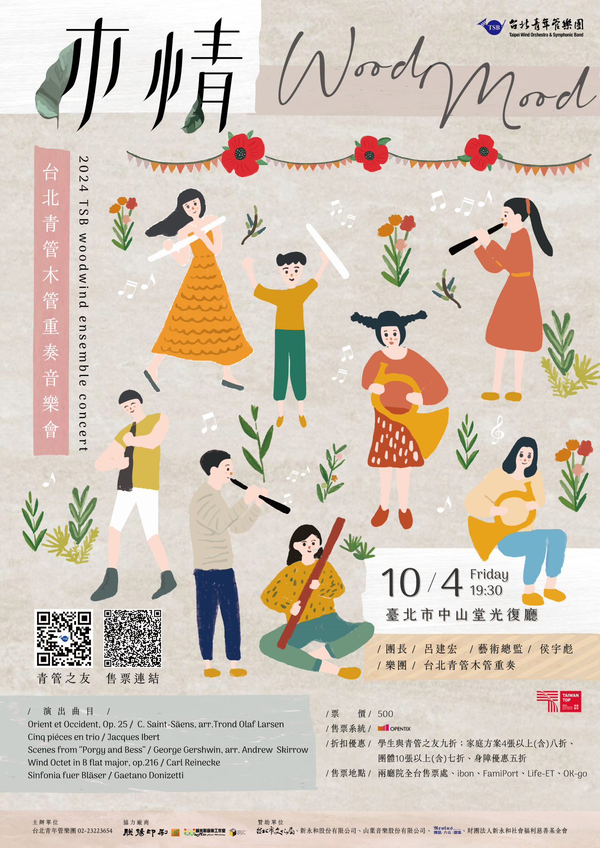 一、2024台北青管木管重奏音樂會,由國內音樂名家與台北青 管老師團團員組成;帶來多首經典木管重奏之樂曲,曲目多元豐富,音樂悅耳動聽,是您不可錯過的音樂饗宴。