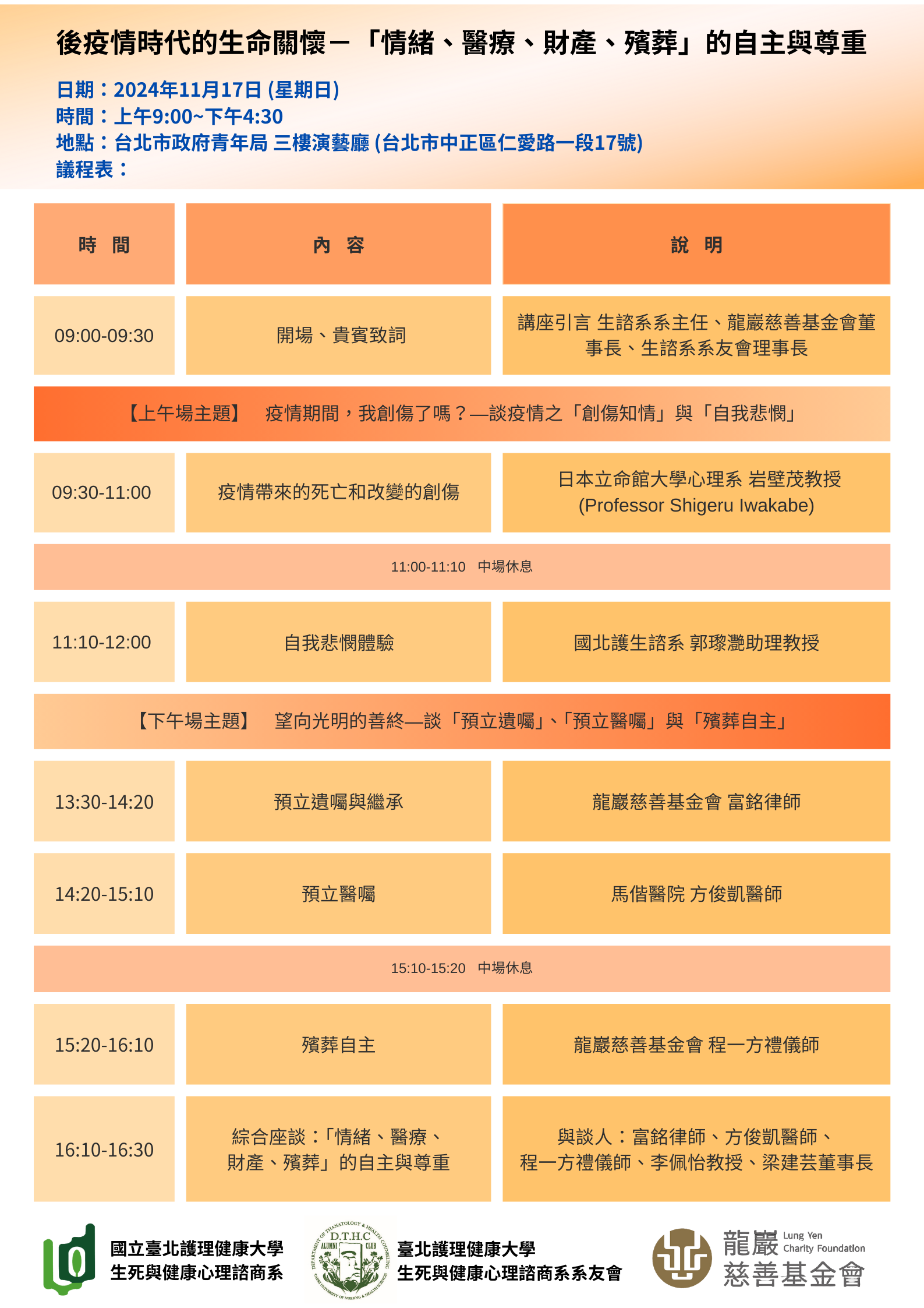 講座主題:「後疫情時代的生命關懷—『情緒、醫療、財 產、殯葬』的自主與尊重」。