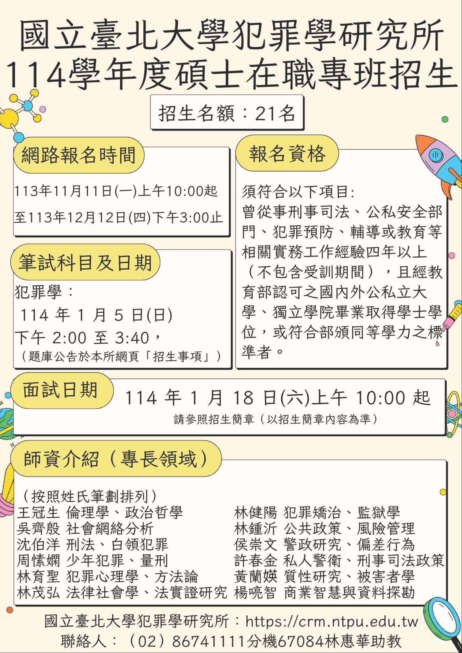 一、本校犯罪學研究所114學年度碩士在職專班招生名額21名, 簡章已公告https://new.ntpu.edu.tw/admission/ntpu, 請考生自行下載列印。
