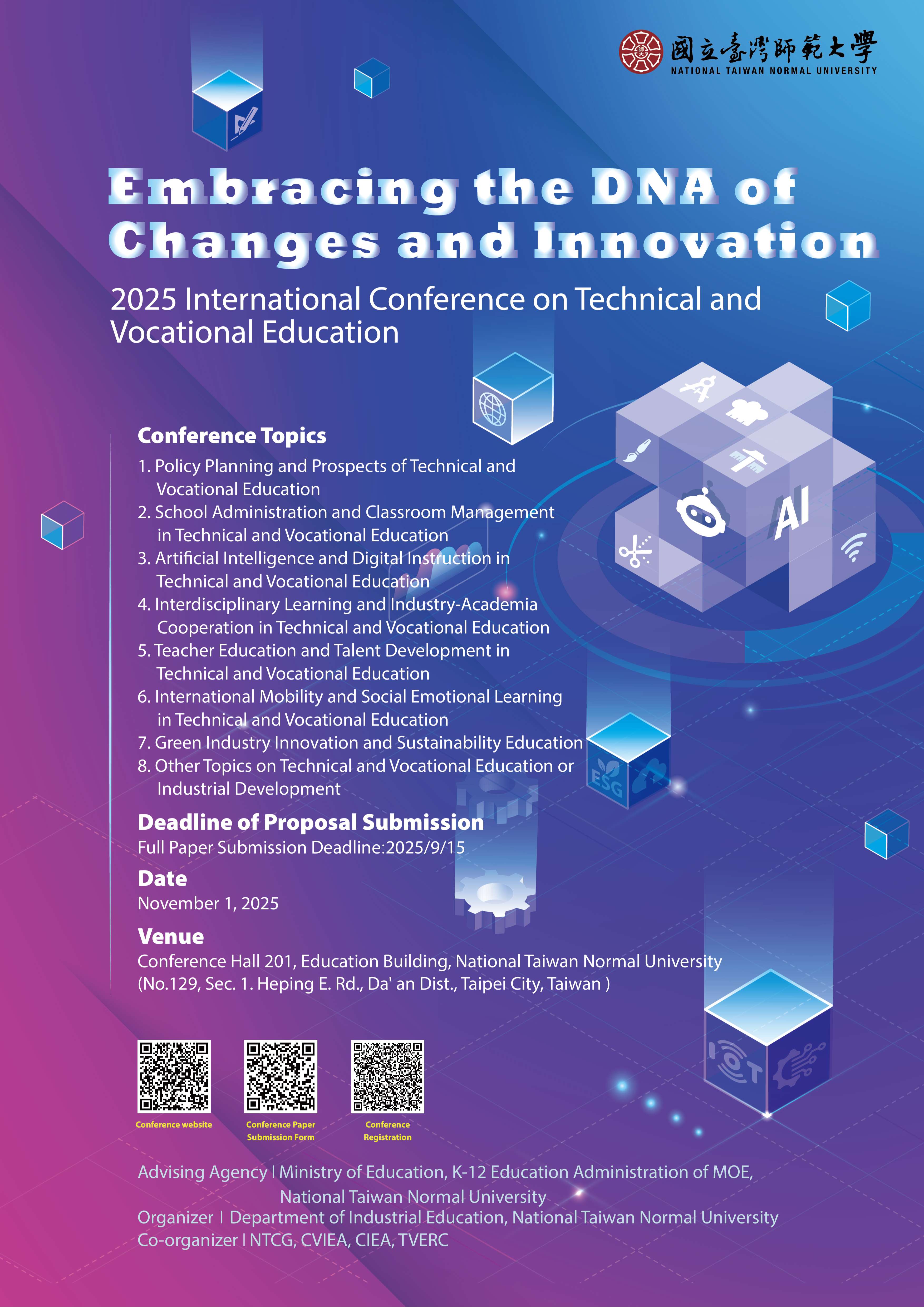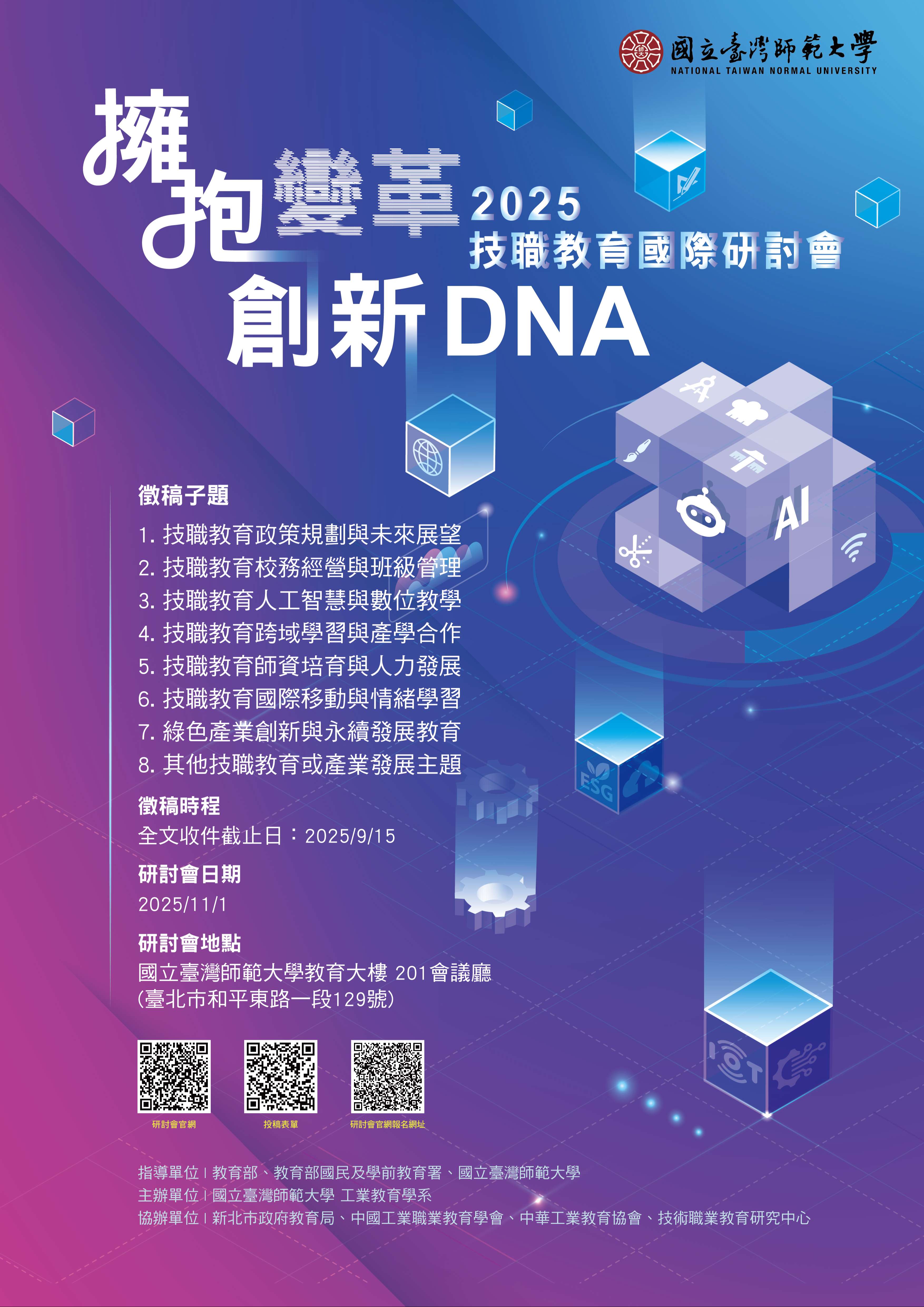 四、檢附本次國際研討會中英文海報各乙份,相關事宜請洽主 辦單位:本校工業教育學系《2025技職教育國際研討會--- 擁抱變革創新DNA》工作小組,連絡電話:02-7749-3388, 或E-MAIL:ntnuie@deps.ntnu.edu.tw。