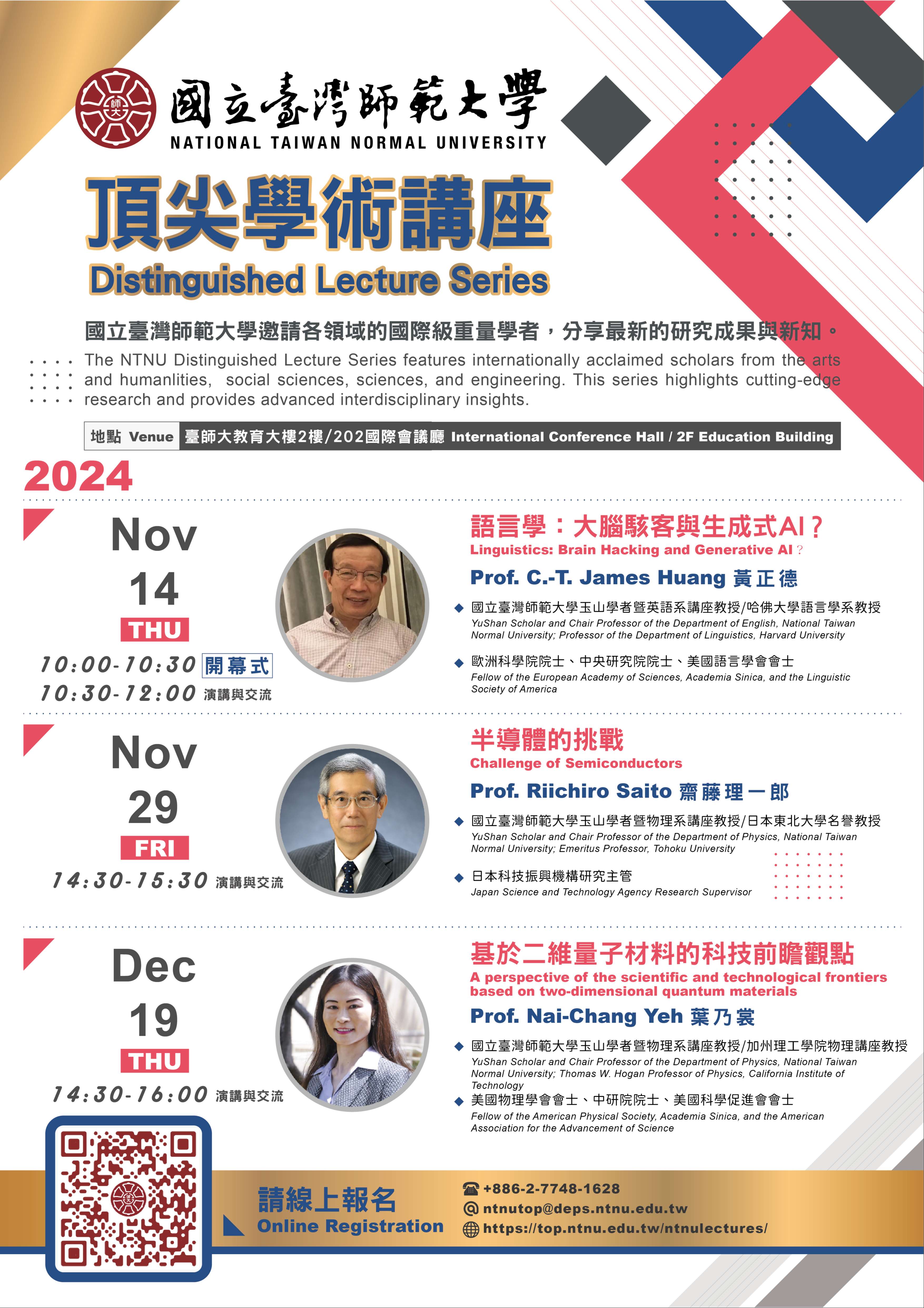 二、活動時間:113年共舉辦3場次學術講座,說明如下。114年 舉辦的場次,將於確認後於網站公告。 (一)第一場次:113年11月14日(星期四)10:00至12:00。講 者:美國哈佛大學語言學系黃正德教授(中研院院士)。 (二)第二場次:113年11月29日(星期五)14:30至15:30。講 者:日本東北大學齋藤理一郎Riichiro Saito名譽教 授。 (三)第三場次:113年12月19日(星期四)14:30至16:00。講 者:加州理工學院葉乃裳物理講座教授(中研院院士)。