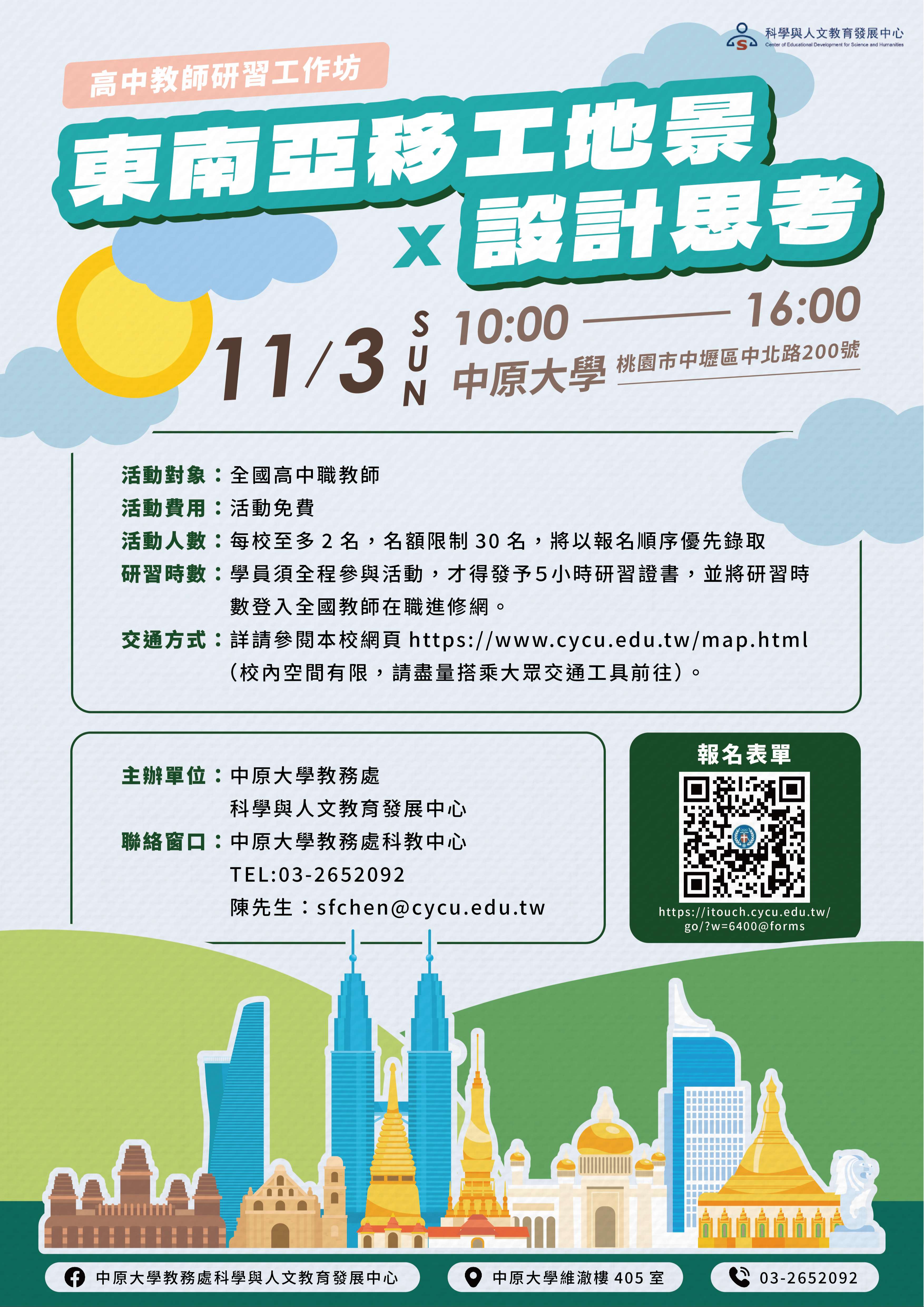 一、活動目的:為讓高中教師瞭解如何將永續議題帶入教學現 場,本校科學與人文教育發展中心舉辦「東南亞移工地景 X 設計思考」工作坊,分享如何將東南亞移工地景結合設 計思考教學,過程中將先帶領老師們走訪中壢火車站東南 亞街區,再討論課程設計如何將地景內容結合移工議題, 讓同學們在學習設計思考的歷程中認識相關議題。