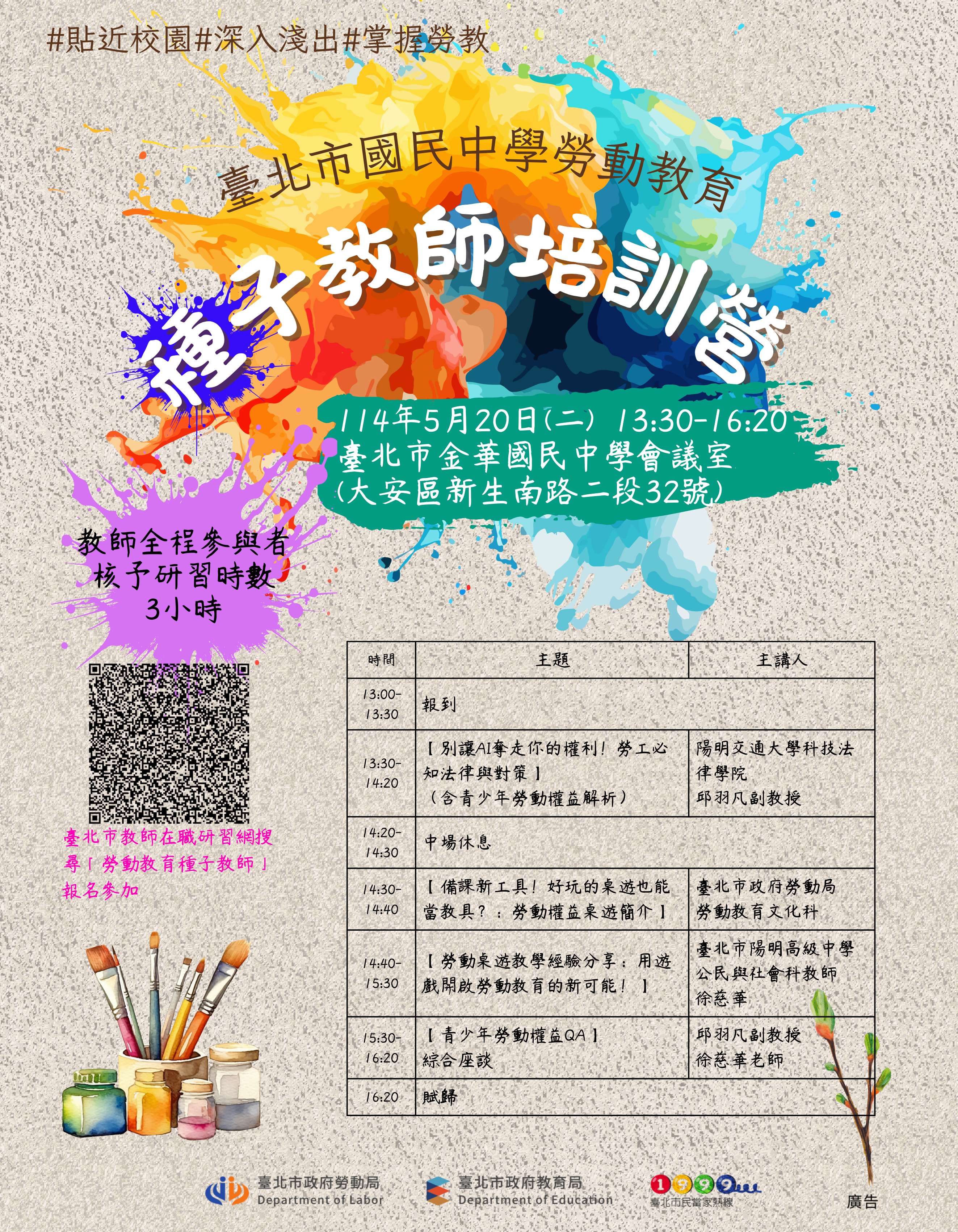 二、旨揭研習相關資訊如下: (一)辦理時間:114年5月20日(星期二)13時30分至16時20分。 (二)辦理地點:臺北市金華國民中學會議室(臺北市大安區 新生南路二段32號)。 (三)實施對象:臺北市公私立國民中學教師(不限類科,以 公民與社會科教師、社會領域優先錄取),預計參與人 數至多20人。 (四)課程內容: 1、【別讓AI奪走你的權利!勞工必知法律與對策】(含 青少年勞動權益解析):邀請陽明交通大學科技法律 學院邱羽凡副教授講授,邱副教授長期關注AI對勞動 型態影響,從青少年打工或未來職場可能接觸到的AI 數位運用衍伸的勞動權益問題等,結合理論與實務進 行分享。 2、【勞動桌遊教學經驗分享:用遊戲開啟勞動教育的新 可能!】邀請臺北市陽明高級中學公民與社會科徐慈 華教師分享桌遊教學經驗,透過遊戲提升課堂互動, 讓學生輕鬆理解勞動權益,探索勞動教育新模式! (五)報名方式:請逕至臺北市教師在職研習網 (https://reurl.cc/o87qQg)報名,全程參與者,核予 研習時數3 小時