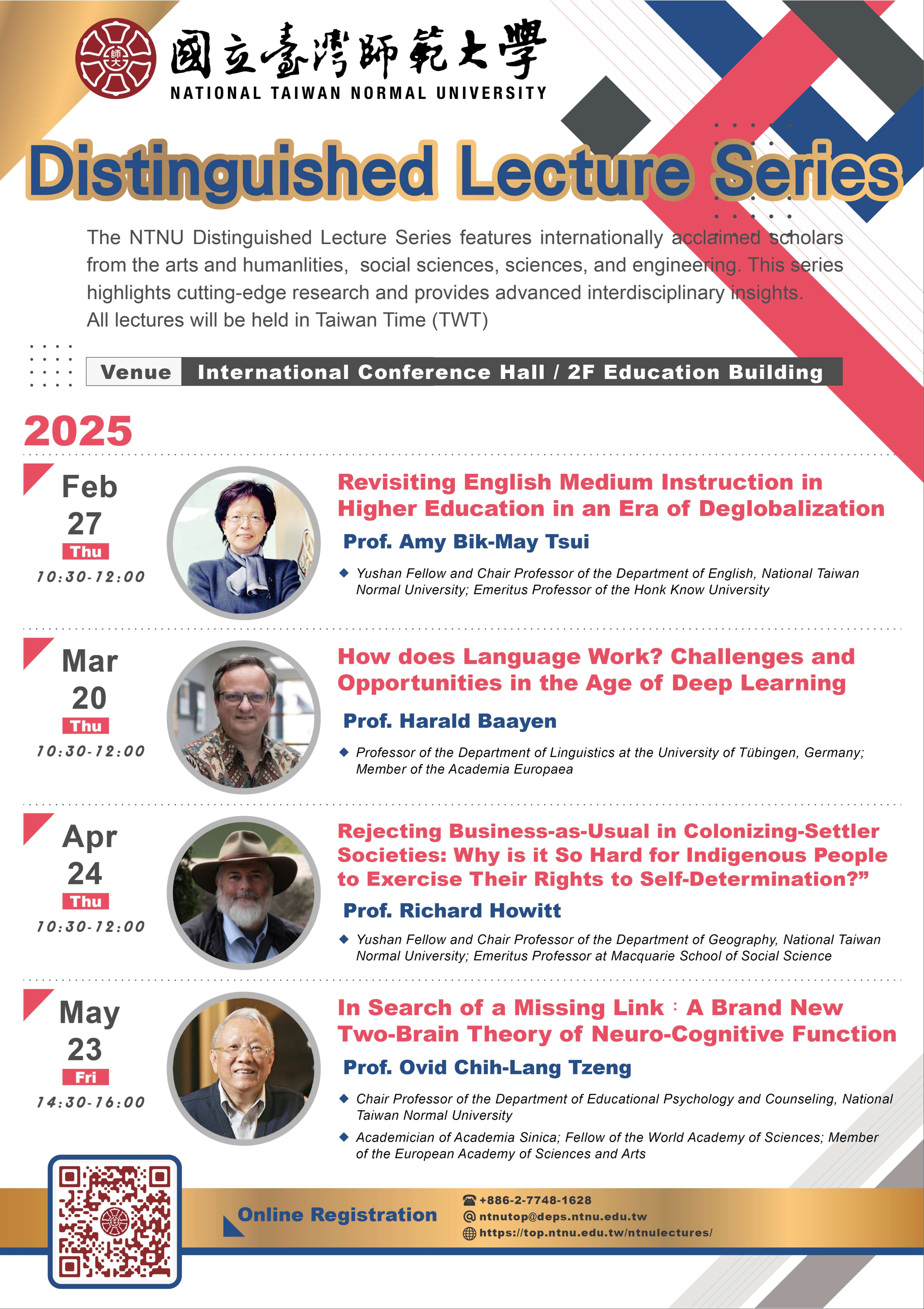 二、活動時間:114年上半年共舉辦4場次學術講座,說明如 下。114年下半年場次資訊,將於確認後於網站公告。 (一)第一場次:114年2月27日(星期四)10:30至12:00。講 者:本校英語學系徐碧美講座教授(玉山學者)。 (二)第二場次:114年3月20日(星期四)10:30至12:00。講 者:德國圖賓根大學語言學系Harald Baayen教授(歐洲 科學院院士)。 (三)第三場次:114年4月24日(星期四)10:30至12:00。講者:本校地理學系Richard Howitt講座教授(玉山學 者)。 (四)第四場次:114年5月23日(星期五)14:30至16:00。講 者:本校教育心理與輔導學系曾志朗講座教授(中央研究 院院士)。