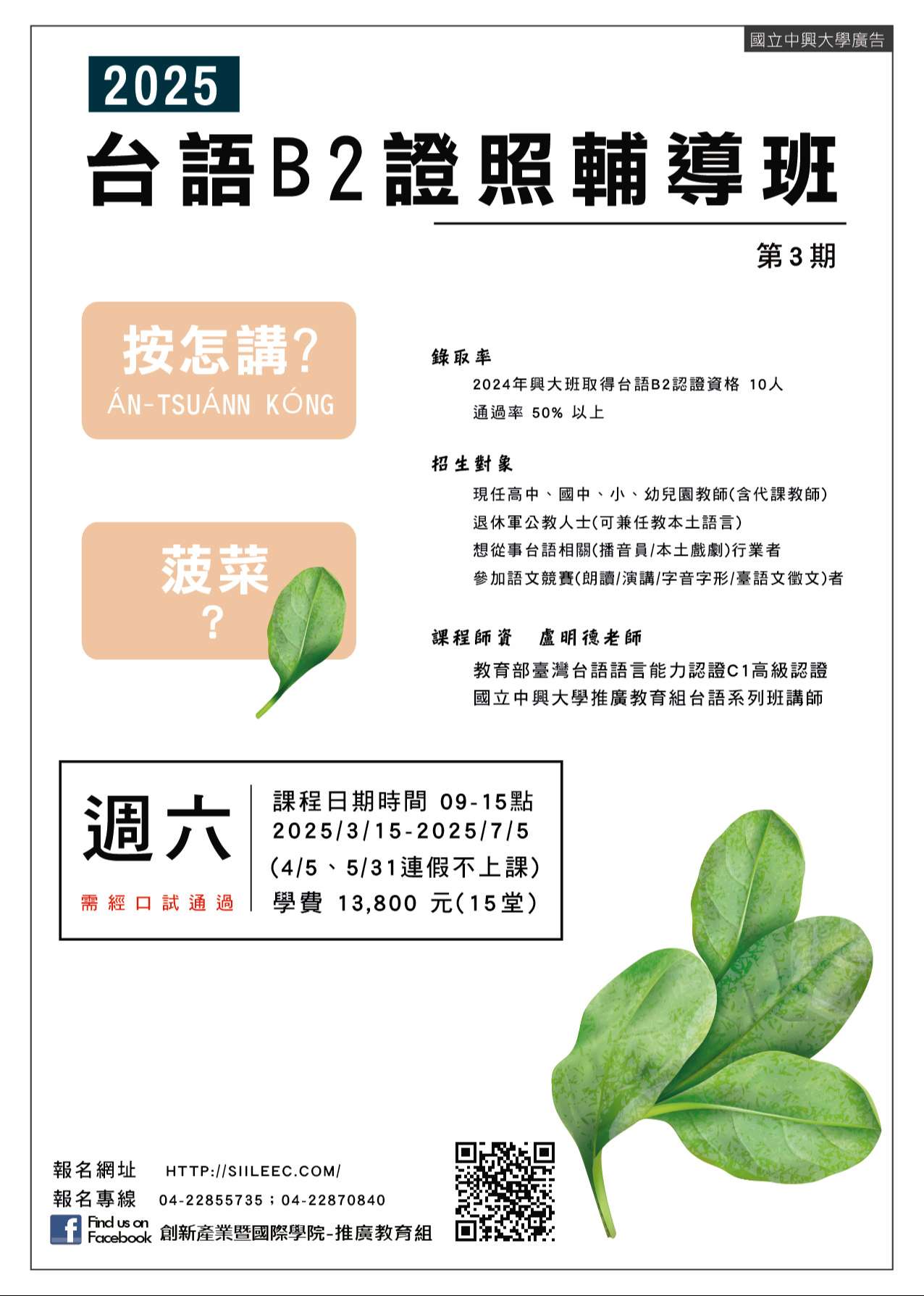 三、培訓資訊請參照簡章,報名等資訊如下: (一)台語B2證照輔導班第3期,2025/3/15-2025/7/5,每週六 9-15點(4/5清明、5/31端午連假不排課),共15次,優惠 價13,800元(不含教材與午餐)。 地點:國立中興大學綜合大樓13樓1304室(暫定)。 (二)報名方式:請至本校創產學院線上報名系統報名 (https://www.siileec.com/index.php? subject_type=39)。即日起受理報名至114年3月5日(五) 下午5時止。