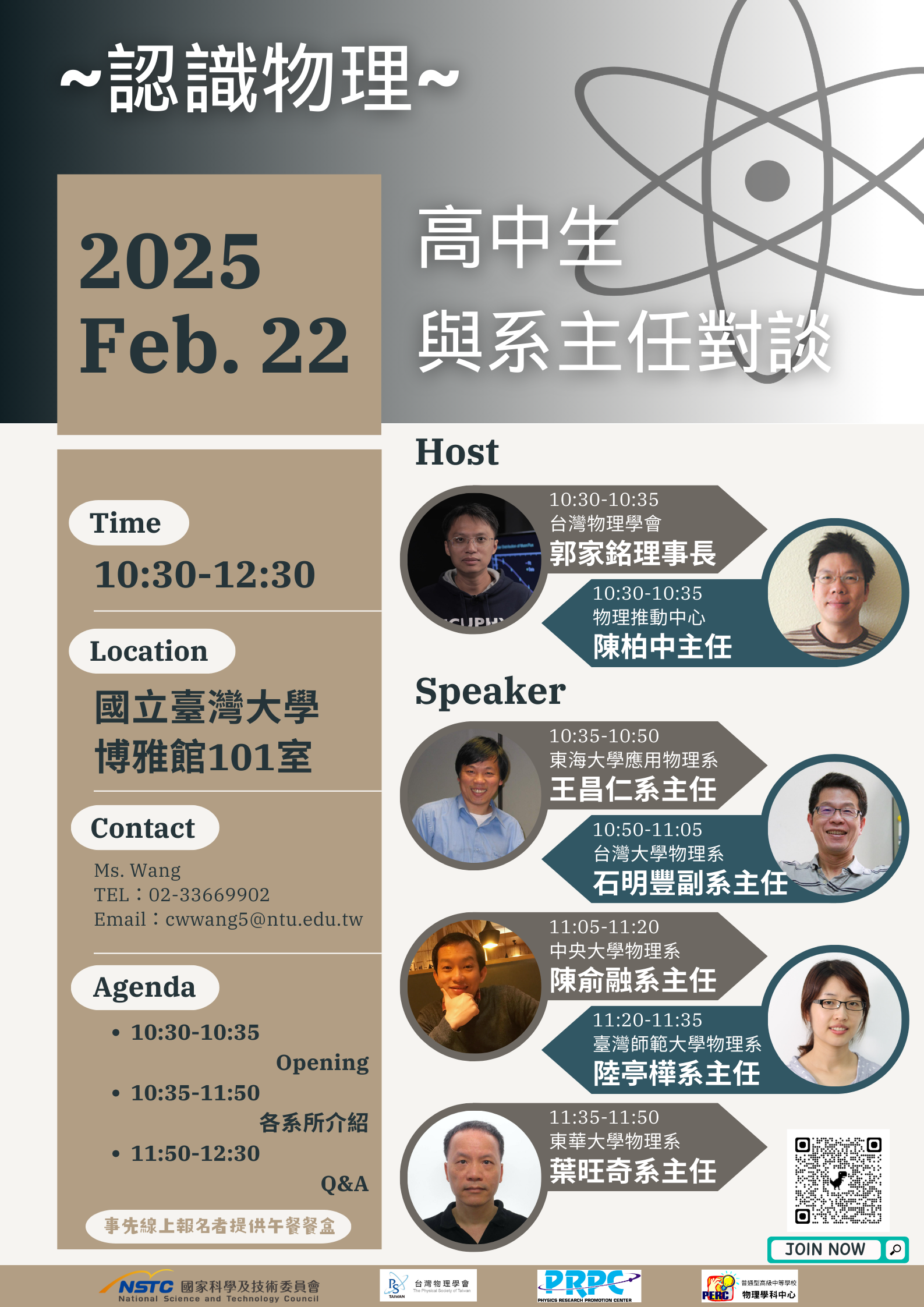 三、活動資訊如下: (一)活動時間:114年2月22日(星期六)上午10:30~12: 30。 (二)辦理地點:國立臺灣大學博雅教學館101教室(臺北市大 安區羅斯福路四段1號) (三)參加對象:全國各高中對物理學習有興趣之學生。