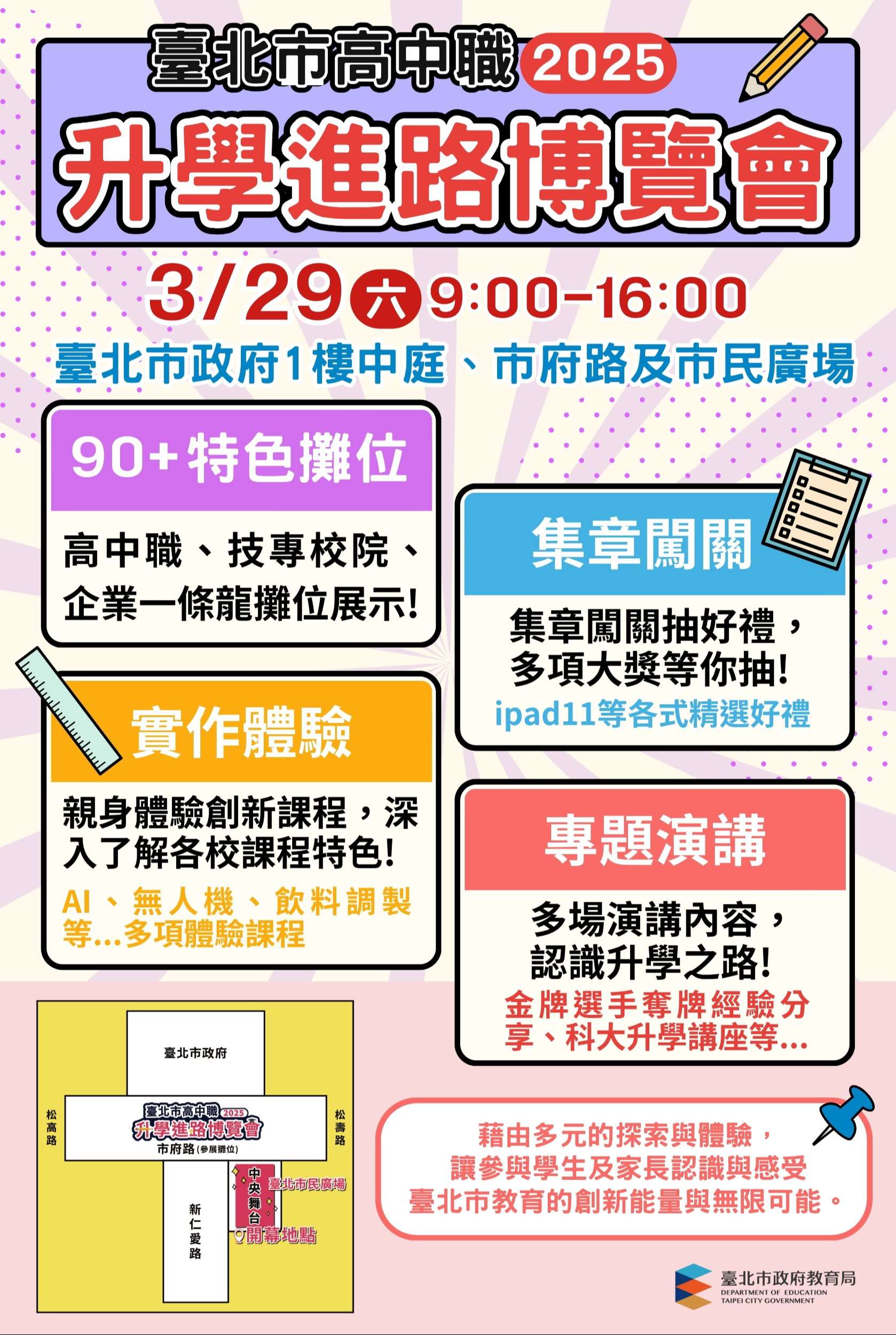 主旨:為宣傳本市辦理「臺北市2025高中職升學進路博覽會」一
