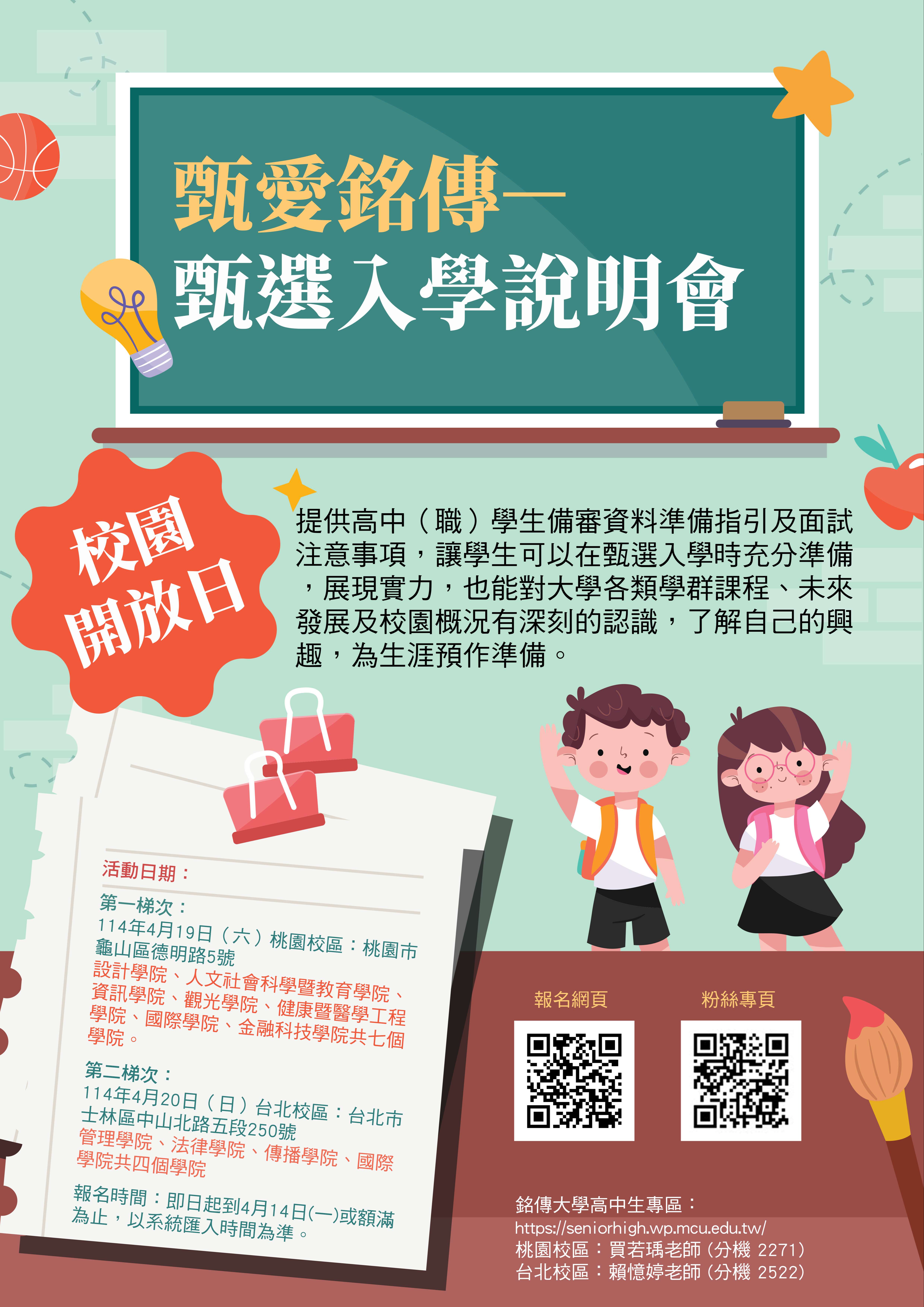 院辦理「甄愛銘傳-甄選入學說明會」校園開放日,即日起